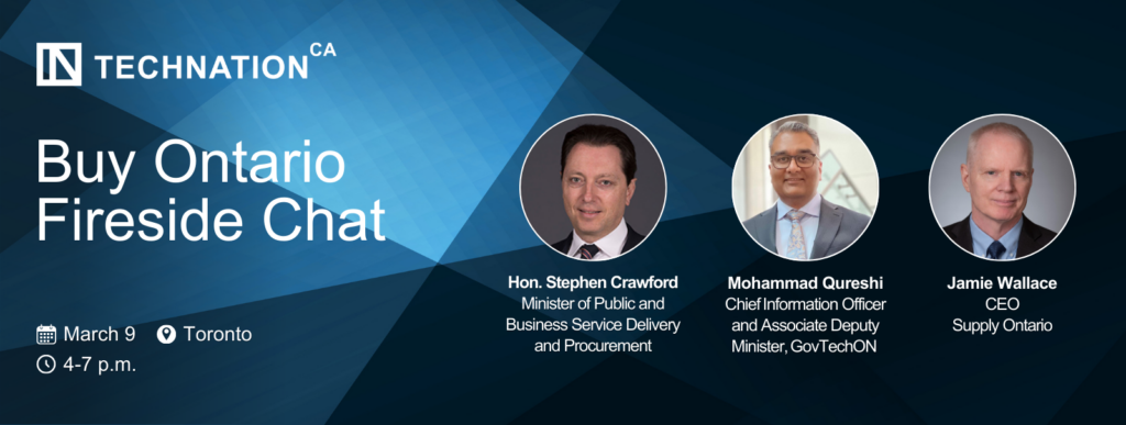 On Monday, March 9, TECHNATION will host a fireside chat on the topic of Buy Ontario with the Hon. Stephen Crawford, Minister of Public and Business Service Delivery and Procurement, Jamie Wallace, CEO of Supply Ontario, and Mohammad Qureshi, CCIO and Associate Deputy Minister, GovTechON.